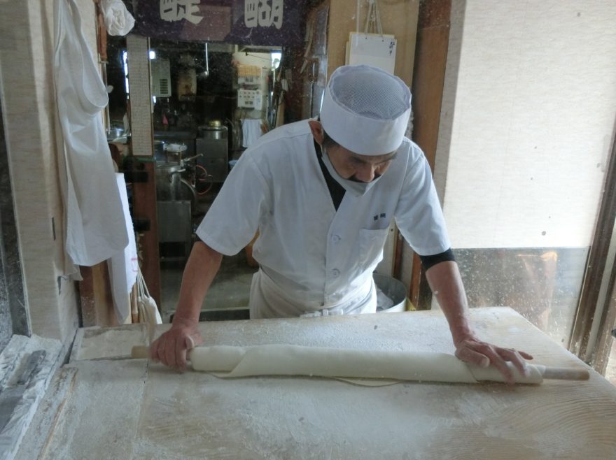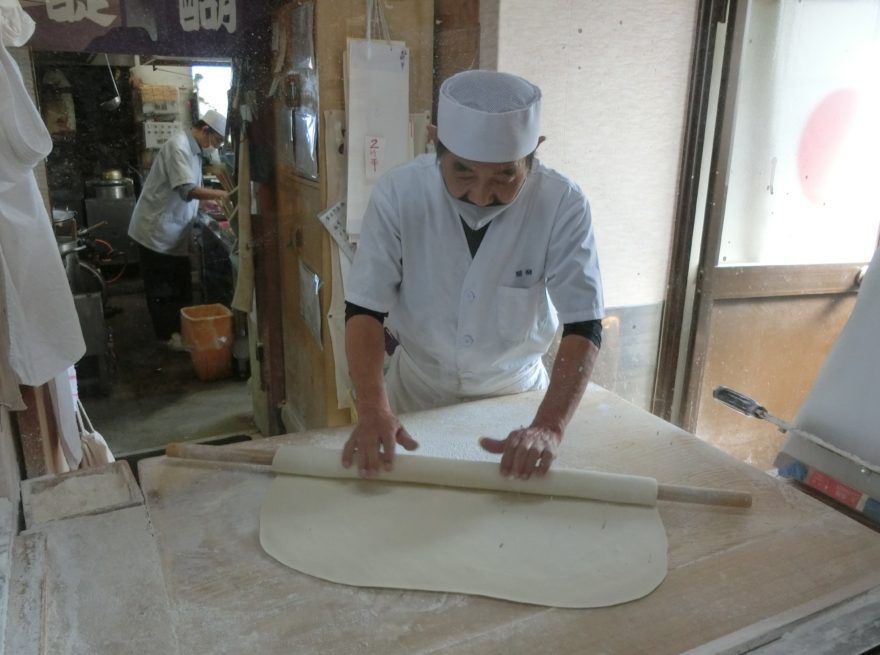 ところが、残念無念。週末だったために、お店は満席状態。駐車場も空席を待つ人たちで溢れていました。あっさりと諦め、翌週の平日に再挑戦しました。さすがに平日はお客さんも少なく、楽々入店できました。幸運だったのは、店主がうどんを打つ姿を見ることができたことです。身振りで撮影してもいいですか?と店長に視線をやると、こっくりとうなずいてくださいました。