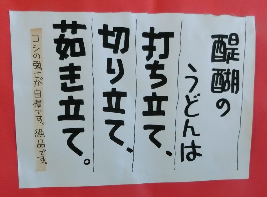 うどんの品目はたくさんありますが、一番の推しは、店名が付けられた950円の「醍醐うどん」です。大人気の醍醐のうどんとは、すなわち「醍醐うどん」のことなのです。醍醐うどんを注文してから、店内を眺めていると、色紙に書かれた言葉が目に飛び込んできました。「醍醐のうどんは、打ち立て、切り立て、茹(ゆが)き立て。コシの強さが自慢です。絶品です。」何と店主自らが絶品だと堂々と宣言しているのです。