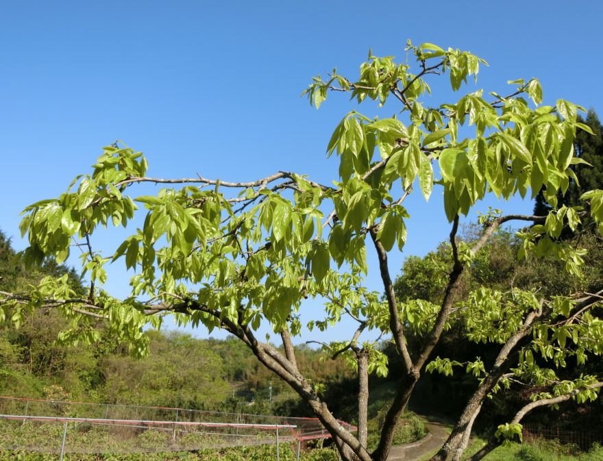 *一夜明けて、今日は快晴でした。朝、梨の消毒作業をするために梨楽園に行くと、新緑が一段と輝きを増していました。もうすぐ大型連休が始まりますが、梨楽園では梨の摘果作業の真っ最中となります。