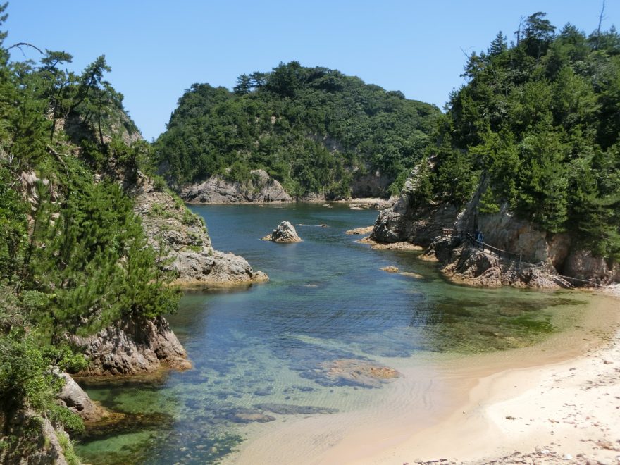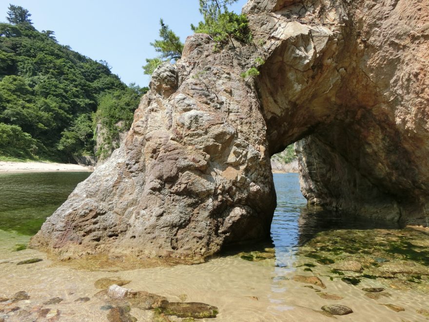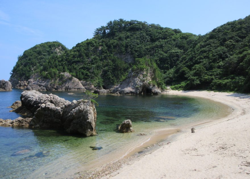 県道の「鴨ケ磯・水尻入口」からつながる遊歩道の階段を下りていくと、「水尻(みずしり)洞門」と呼ばれる名所に到着します。ここが海岸美との最初の出合いの場です。誰も必ず、手にしたカメラのシャッターを押し始めることでしょう。これから先にどんな景色が待っているのかと、ワクワクしてきます。遊歩道を東に進むと、美しい砂浜と緑の松に覆われた岩石海岸と穏やかで透き通る海の自然美が目に飛び込んできます。どの角度からカメラのシャッターを切っても絵葉書になる景色が広がっているのです。取材日にはカナダのバンクーバー出身の家族が海水浴を楽しんでいました。平日だったので、完全なるプライベートビーチ状態でした。