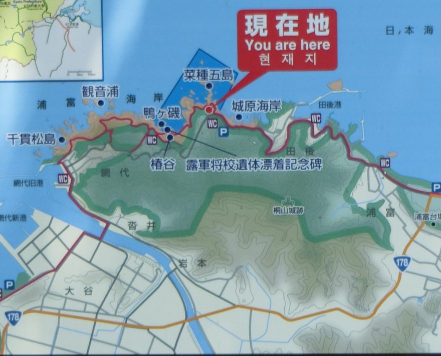 足元に気を付けながら遊歩道を進んでいくと、「ロシア軍将兵遺体漂着記念碑」が見えてきました。記念碑建立の石碑には、日露戦争で田後(たじり)沖に漂流していたロシア軍将兵2人の遺体を村民が丁重に葬り供養したと書かれていました。そして、この記念碑は当時の村民の人類愛を顕彰するために、昭和37年(1962年)、岩美町出身の初代国連大使、沢田廉三が建立したそうです。