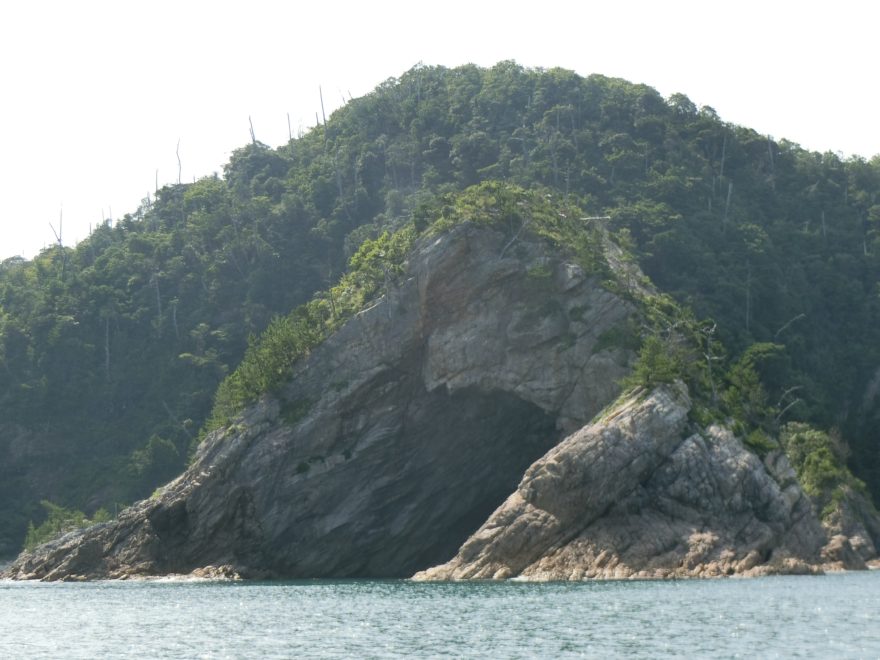 小型船の定員は12名で満席でした。定刻に田後港を出港し、船は浦富海水浴場の沖合を順調に進んで行きました。船長さんの説明もわかりやすく、絶好調ならぬ❝舌口調❞でした。浦富海水浴場は高校時代に臨海学校で遠泳をした思い出の地でした。光陰矢の如し、いや光陰ロケットの如し、瞬く間に半世紀以上が過ぎてしまったのです。