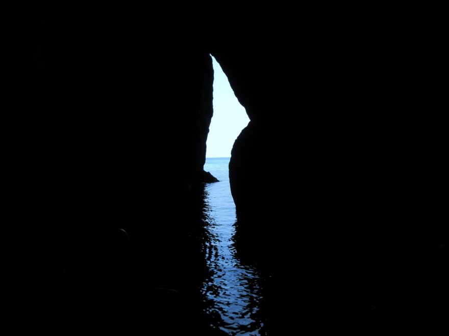大きな洞穴が迫ってきました。海の色が透明です