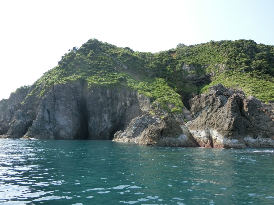 羽尾岬に近づくと海食崖や海食洞が見えてきました。どれほどの溶岩が流れ出たのか、想像を絶する地殻の大変動があったに違いありません。岬の先端を回ると龍神洞が見えてきました。波が穏やかなので洞内に入ることができるとの船長さんの説明に胸が高鳴りました。