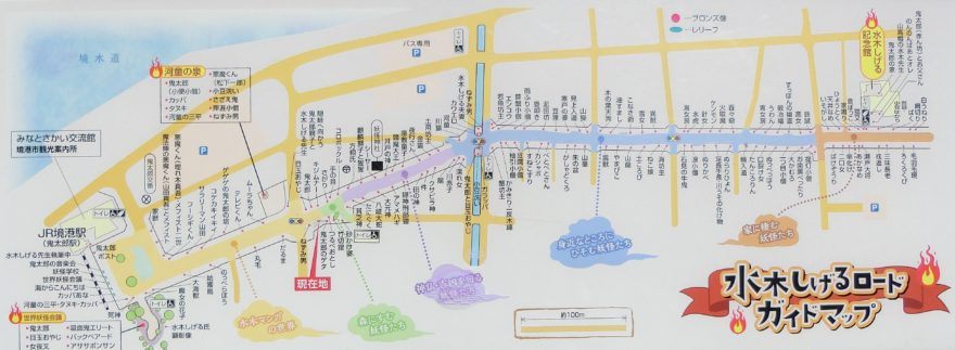 水木しげるロードは約800mです。左手の境港駅前から右手の水木しげる記念館までの間です