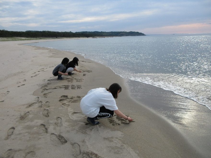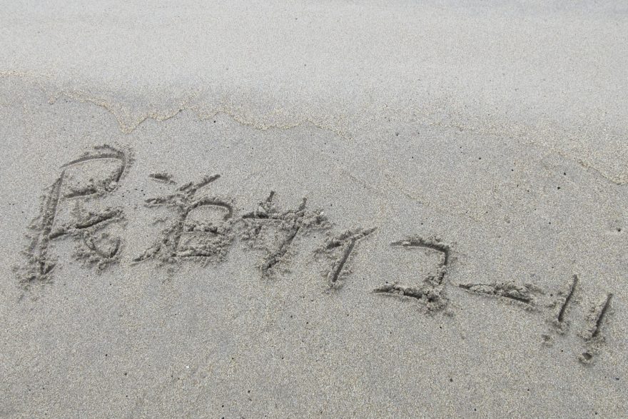 「鳴り砂」のきれいな砂浜に文字を書いたよ