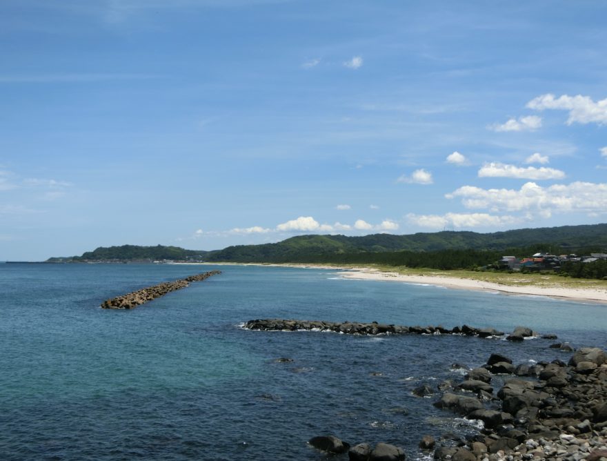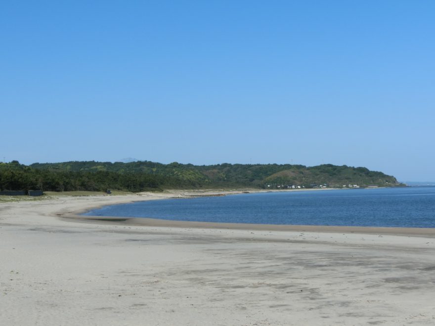 一里浜の宇谷方面からの眺めです。半島の先端部が「潮風の丘」です