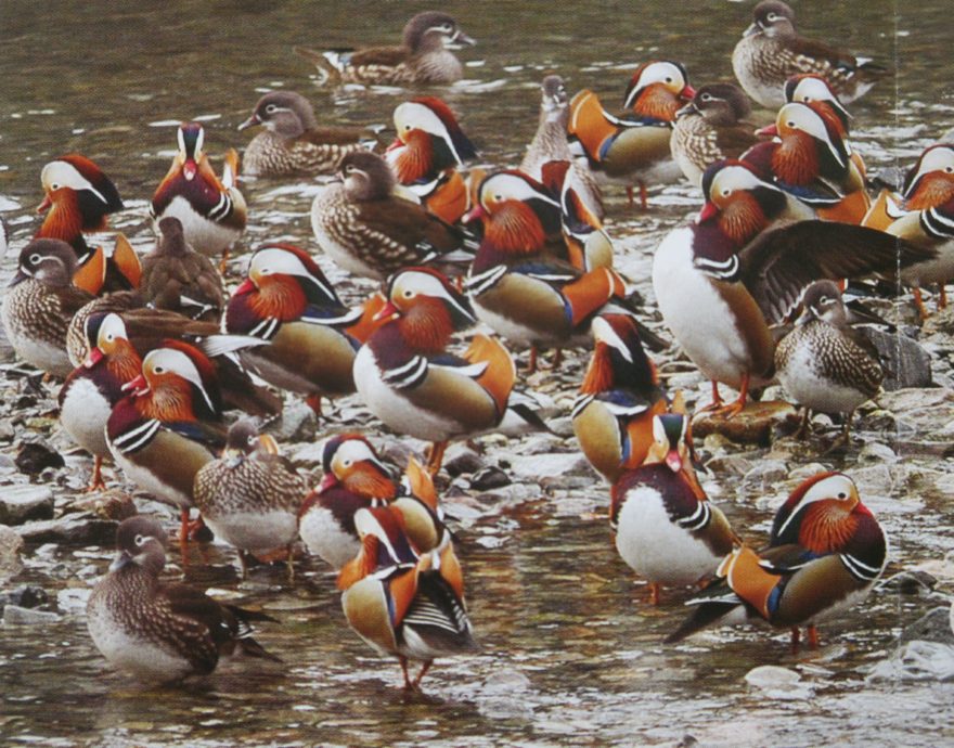 11月8日(金)この日も爽やかな青空が広がる行楽日和でした。ブログに写真を掲載することが常に念頭にありますので、取材日は週間天気予報を見ながら決めています。根雨に到着後は、オシドリ観察小屋に向かいました。残念ながら、大部分のオシドリは川向こうの方で休憩していました。職員さんに尋ねると、観察するには早朝か夕方がよいとのことでした。肉眼では見えにくかったのですが、望遠鏡が数台設置されているので、レンズ越しですが、オシドリの色鮮やかな姿を観察することができました。