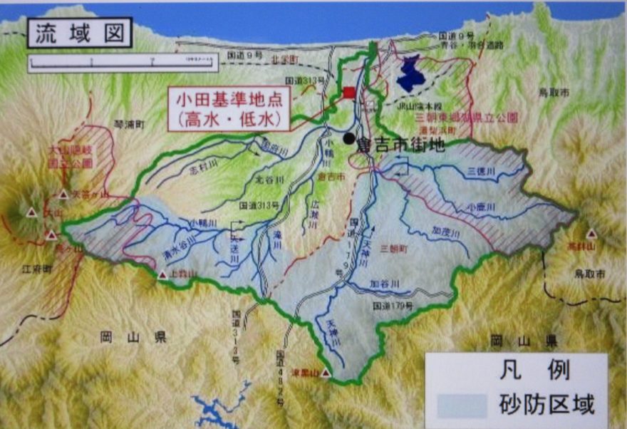 なぜこんなにも洪水被害が度々発生したのだろうか?室町や江戸時代だったので堤防を築く技術が不十分だったからだろうか?突如として大いなる疑問が湧いてきたのです。しばらくの間、思いめぐらしていると、ある考えが浮かんできました。もしかしたら、久米郡、河村郡、そして倉吉町のある東伯耆の地形的な要因が洪水の原因になっているかもしれないぞ、とひらめいたのです。