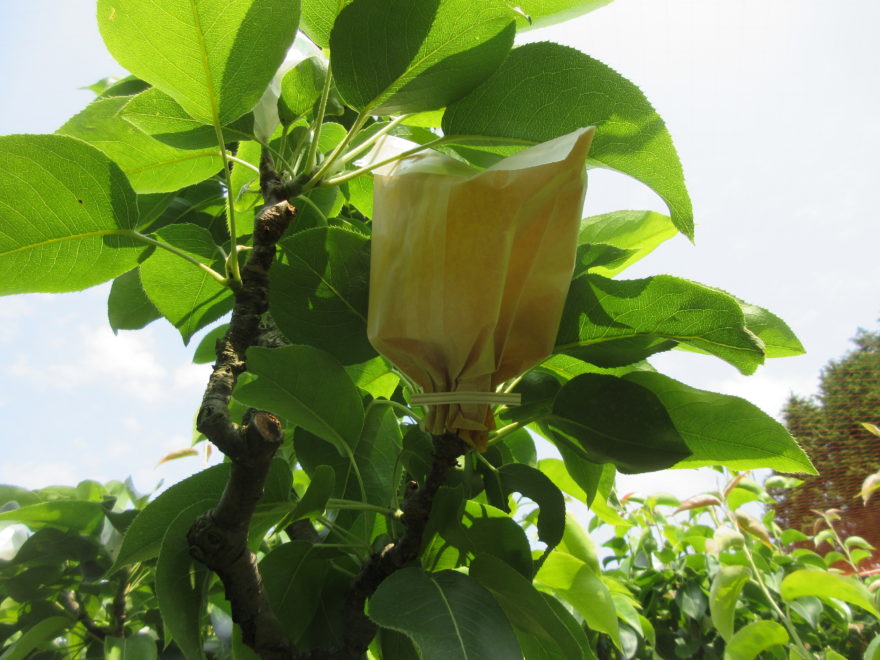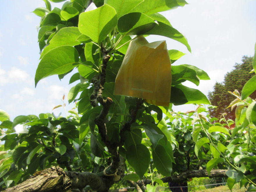 二十世紀梨の実の赤ちゃんを病気や毛虫から守るために、5月の上旬には“小袋かけ”をします。梨の実は成長してだんだんと大きくなります。そして、小袋が破れるまでに次の作業として“大袋かけ”をします。果実に2回袋掛けをするのは、梨栽培だけの作業だと言われています