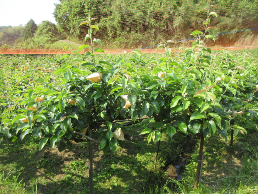 大袋かけが済むと、梨の栽培作業の前半戦の終了となります。梨畑の上部に見える赤色は、カラス対策の防鳥網です。