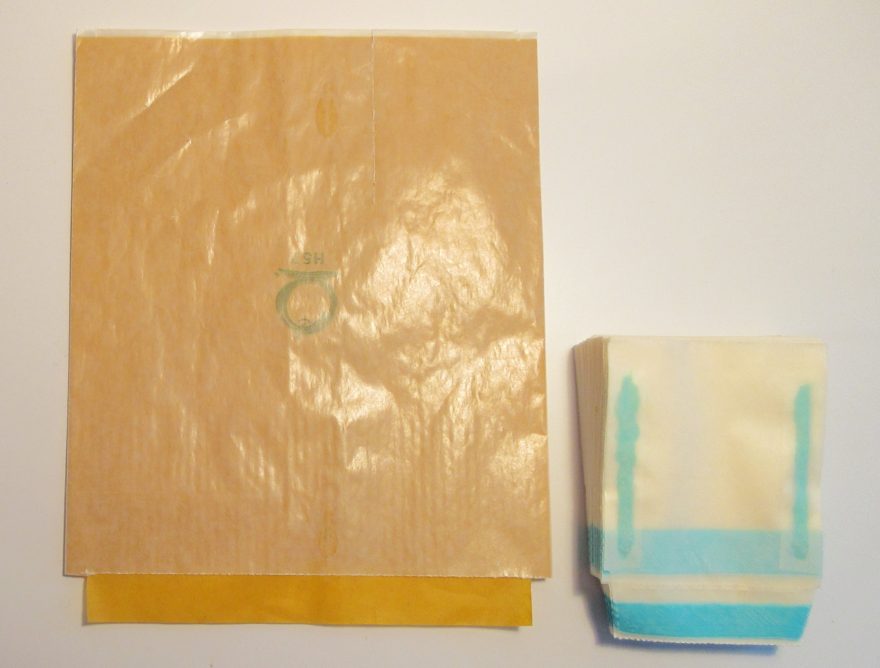 左が大袋、サイズは14.7㎝×17.5㎝です。右が小袋、サイズは6.5㎝×7.5㎝です