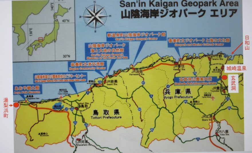 浦富海岸を調べているうちに、山陰海岸国立公園や山陰海岸ジオパークについてより一層興味がわいてきたのです。山陰海岸国立公園は、東は京都府網野海岸から始まり、西は鳥取砂丘までの約75㎞の範囲です。山陰海岸ジオパークは、鳥取県と兵庫県と京都府にまたがる山陰海岸国立公園とその周辺地域からなるジオパークです。