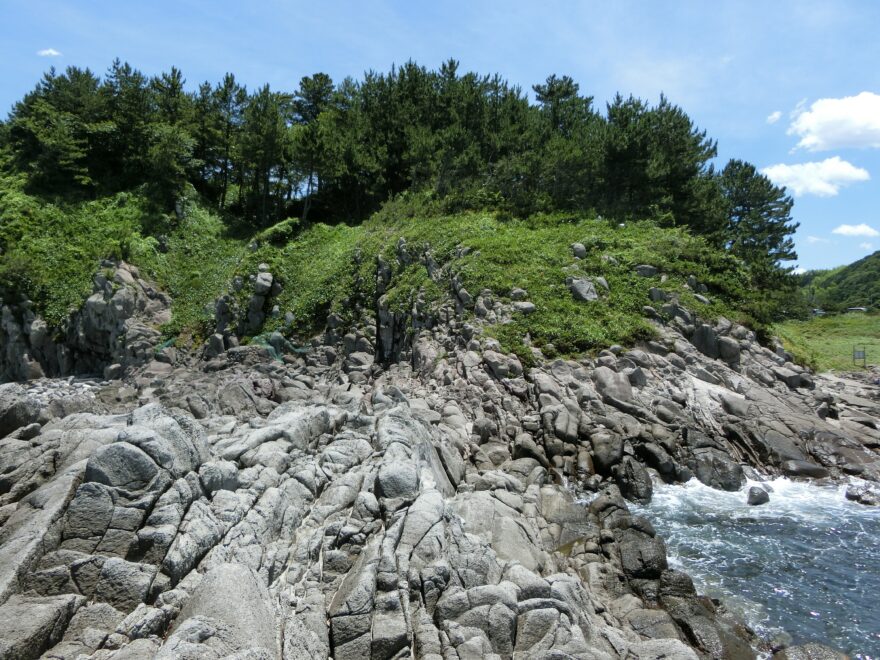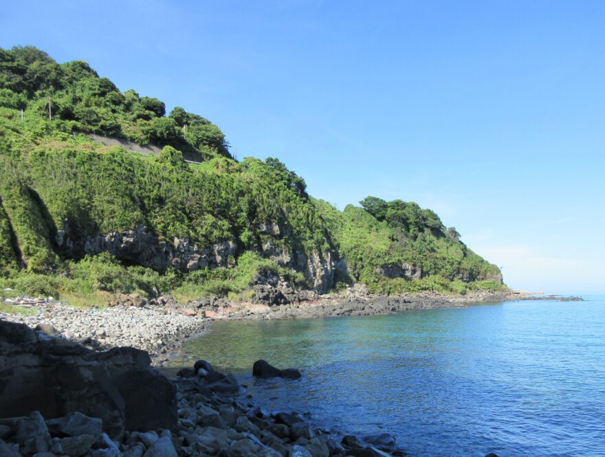 宇野地区の海岸は“御冠山(みかむりやま)安山岩”の溶岩でできた海岸です