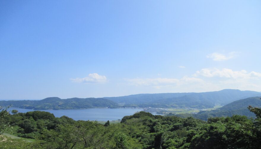 右側の頂上が平らな山が「鉢伏山」中央が東郷池、東郷池の左側奥の冠のような形の山が「御冠山(みかむりやま)」です