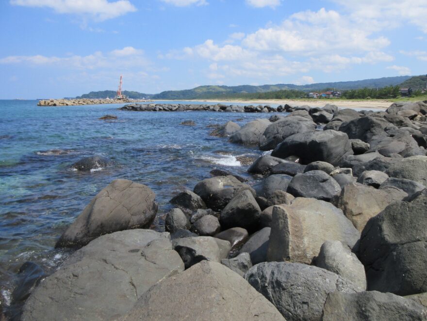 因幡国を峠越えすると、すぐ西隣にある集落が小浜地区です。小浜の西側には“尾後鼻(おごばな)”と呼ばれる海に突き出た小さな岬があります。この尾後鼻の海岸や小浜の砂浜には黒っぽい色をした巨岩が転がっています。