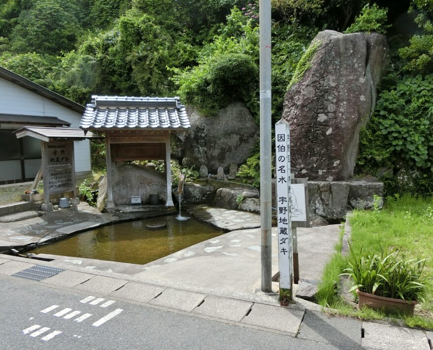 “宇野地蔵ダキ”は梨楽庵のある湯梨浜町にあります。梨楽庵からは車で5分ほどの所にあります。冒頭で紹介しましたように、鳥取県の水道水は「おいしい」です。もちろん湯梨浜町の水道水もおいしいのですが、こんなにも身近な所に「平成の名水」があるので、毎月2回の水汲み当番を私は楽しみに務めています。