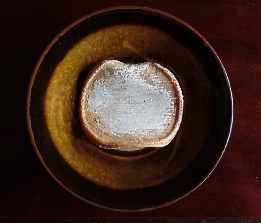乾燥させると、生姜蜜は白く浮かび上がります。城北たまだ屋で受け継がれたせんべいの情景は、日本海の荒波です。刷毛塗りされた生姜蜜は、白波を表現しています。