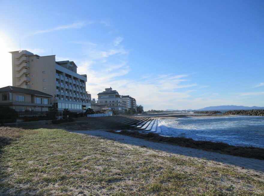 昭和10年代には、海岸浸食が進み、温泉旅館が流失する被害も発生しました。昭和30年には、大波浪によって一夜にして砂浜が約20mも浸食したこともありました。洪水防止のために、日野川の河川工事や上流部のダム建設、堰(せき)などの改築工事が進められ、土砂の流出が減少してきたことも砂浜が細くなった要因だと言われています。