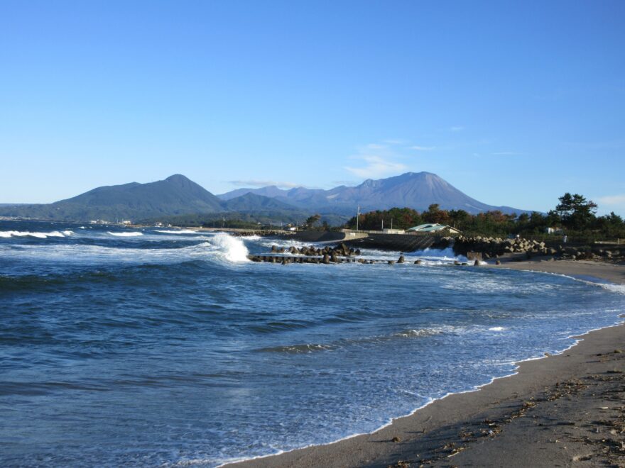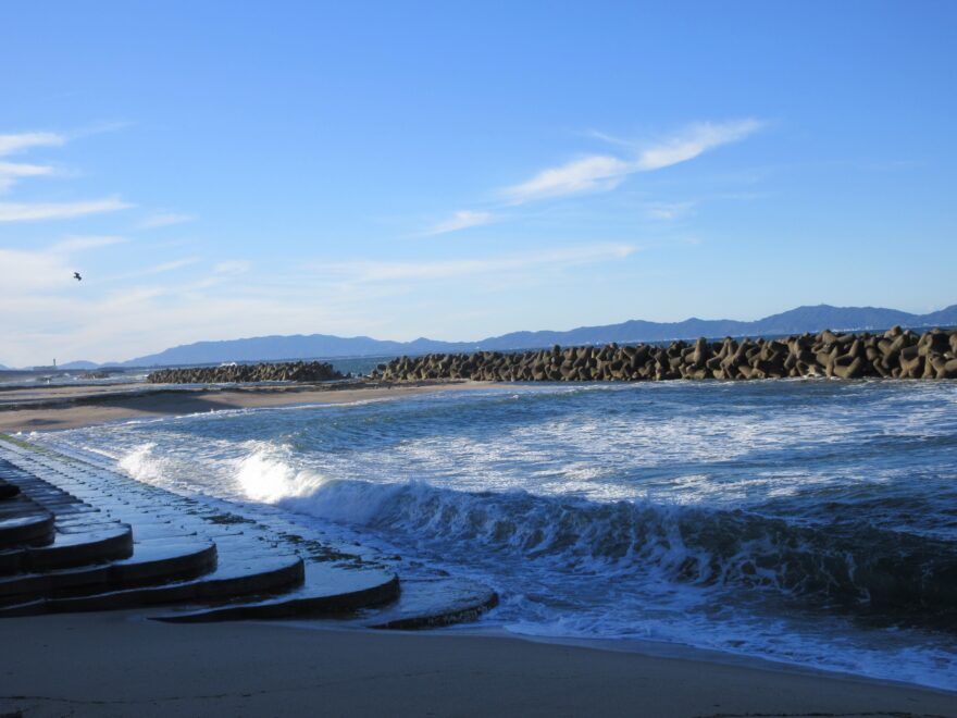 沖合に積み上げられているのが「消波ブロック」です。この離岸堤で砂浜の浸食を防いでいます。後ろの山並みは、島根半島です