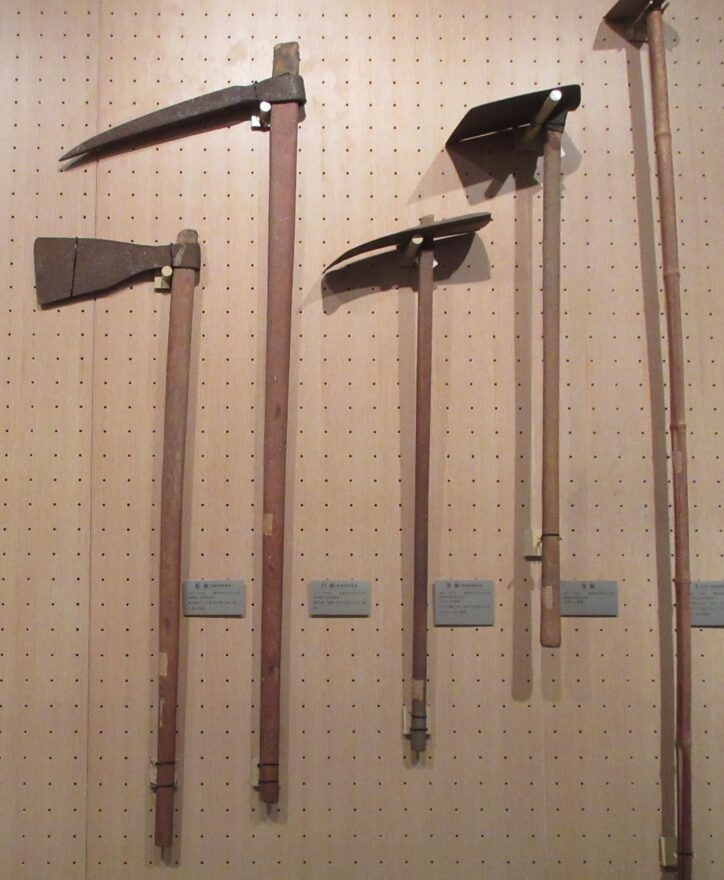 写真③左から2番目が打鍬(うちぐわ)です。長さは1m80㎝ほどです