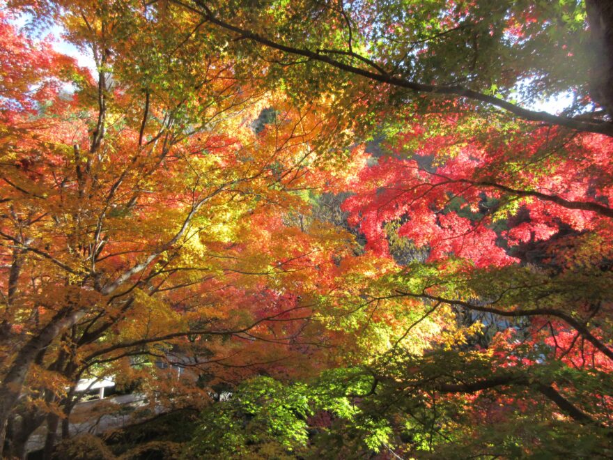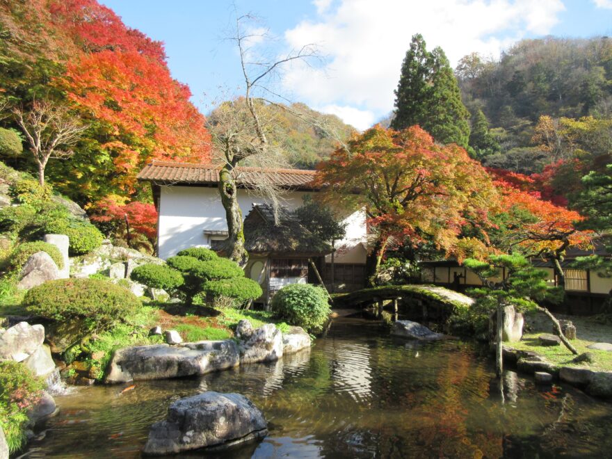 名庭園にも負けず劣らず人々を感動させるのが、紅葉の美しさです。邸宅内や周辺には色鮮やかな紅葉が降り注いでいました。邸宅の直ぐそばを澄み切った渓流が音を立てて流れています。その渓流沿いにも大きな紅葉の木が、赤や黄色や緑の色模様で衣替えをして、私たちを楽しませてくれました。
