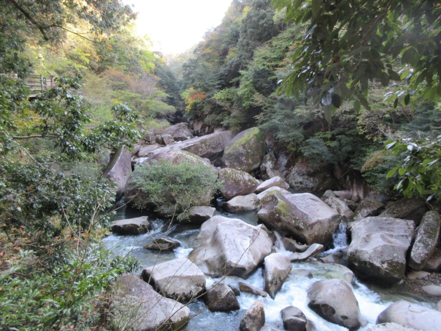 鬼の舌震の遊歩道は全長約2㎞もあるのですが、前回私が歩いた道を短縮して散策しました。切り立つ絶壁とゴーゴーと流れる谷川の音、鬼なのか、ゴジラなのか、怪腕を振り回して投げ捨てられたように折り重なる巨岩や奇岩の姿は、確かにここでしか見ることができない絶景でした。