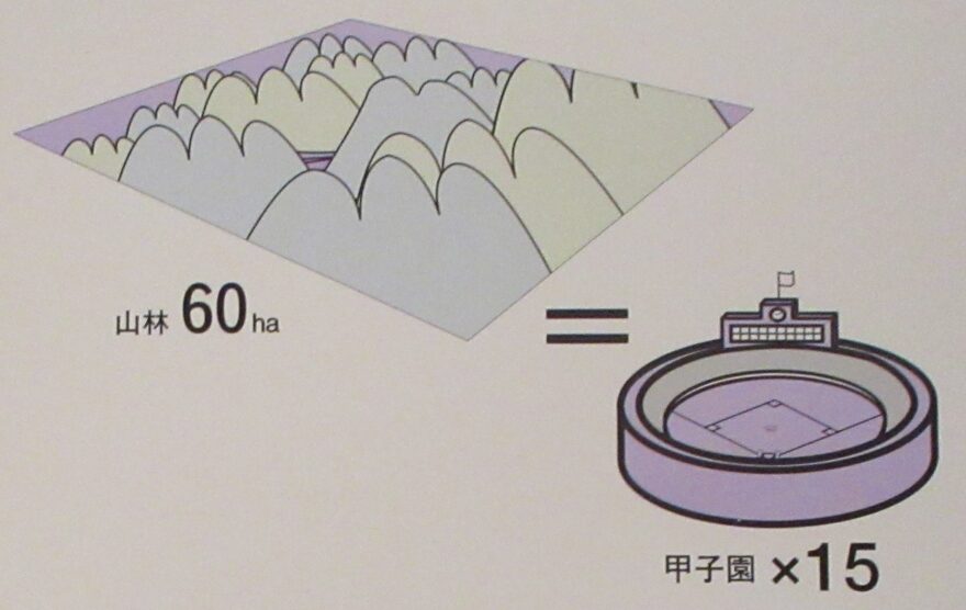 一ヶ所のたたら製鉄炉で使う一年分の炭を供給するためには、60haの山林面積が必要とされました。これを甲子園球場で換算すると、何と、15個分に相当するのです。