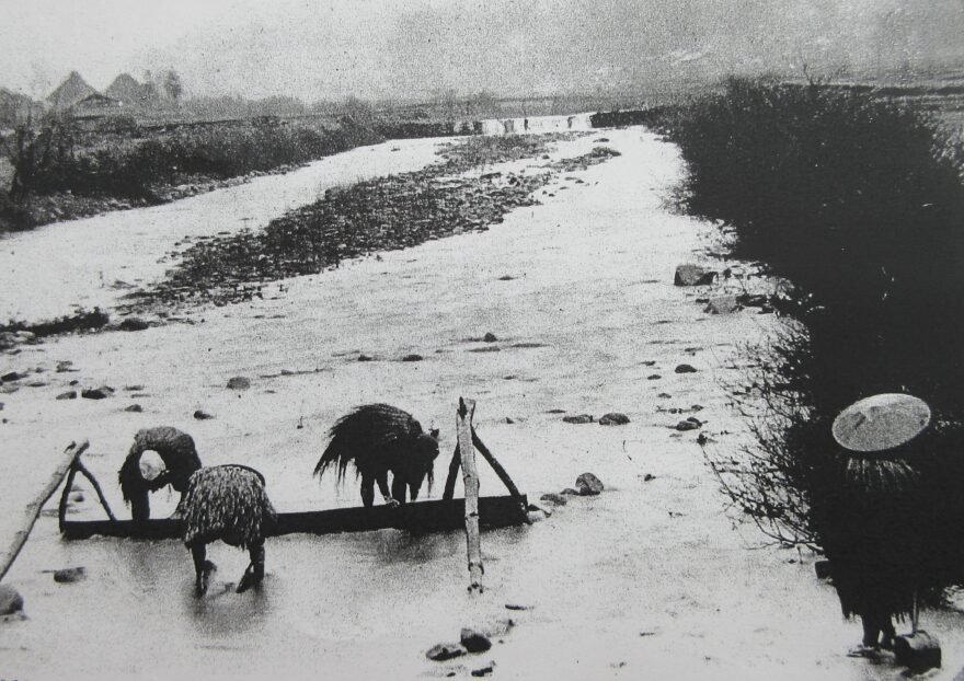 現在の鳥取県伯耆町を流れる野上川で「川砂鉄」を採っているようすです。大正時代の初めごろの貴重な写真です