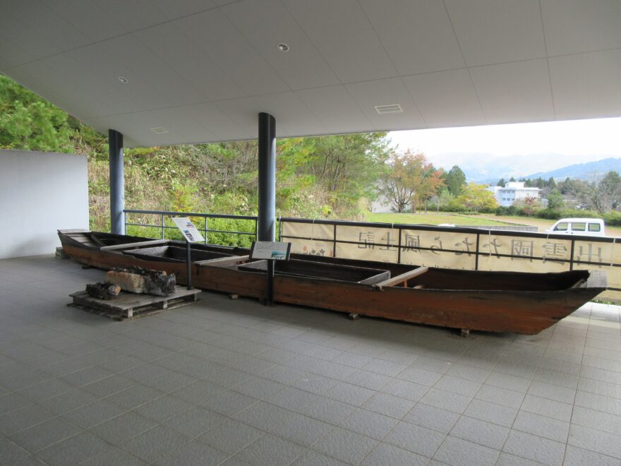 川砂鉄の採集に使われた「川船」です。「奥出雲たたらと刀剣館」の入り口に展示されています
