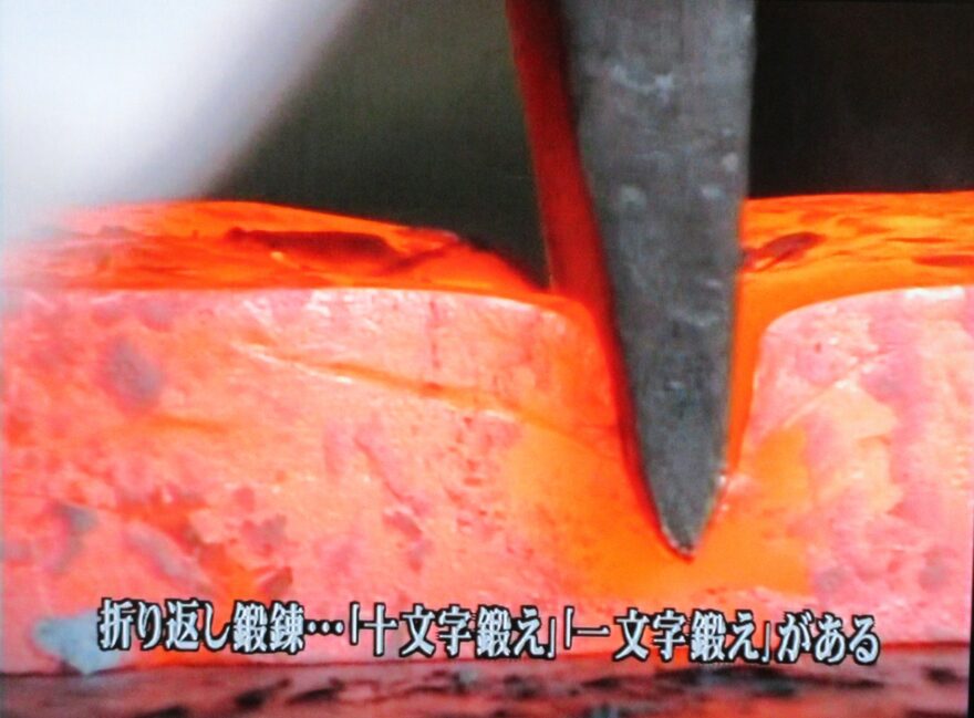玉鋼(はがね)のかたまりを熱し、金づちでたたいて薄くのばします。それを半分に折り返し、また、たたいて伸ばします。金づちでたたくことによって、不純物が火花となって飛び散っていきます。