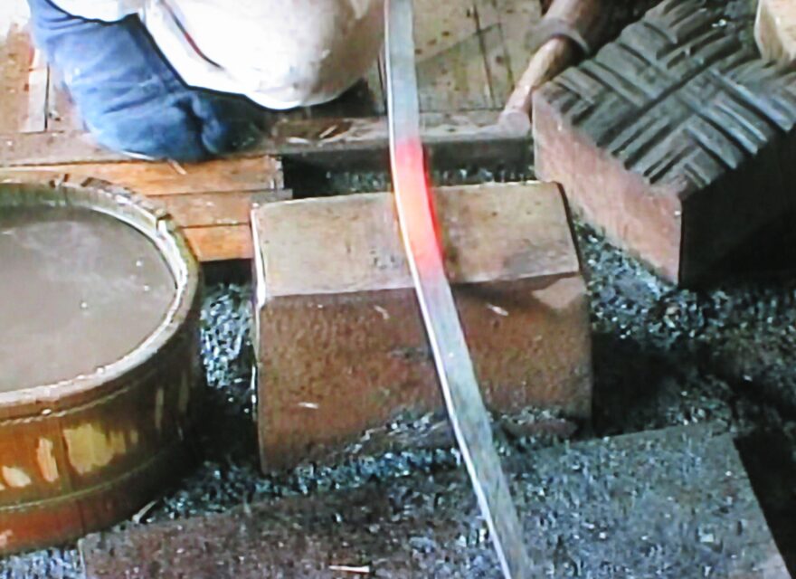 日本刀の刃(は)の部分を硬い鋼(はがね)に変化させる作業です。焼刃土(やきばつち)を塗った鋼(はがね)を800℃ほどに熱してから、水につけて冷やします。