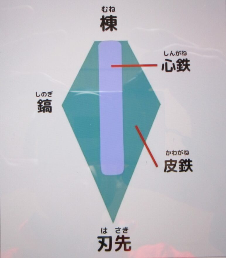 不純物が少ない玉鋼は硬い性質があるので、日本刀が完成したときの「刃」の部分になる“皮鉄(かわがね)”として使われます。軟らかい性質の玉鋼は、日本刀の芯(しん)の部分になる“心鉄(しんがね)”として使われます。