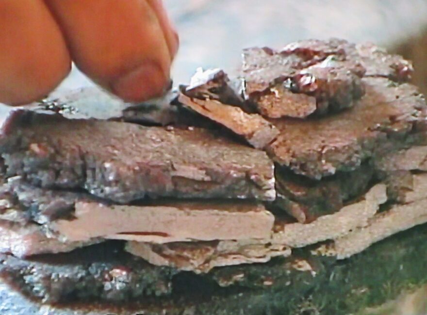 玉鋼を1000℃近くの温度で熱し、金づちでたたいて厚さ5mmほどの平らな形に整えます。次に、板状になった玉鋼を小さく割って、割れ方や断面の様子を見て品質を見極めます。