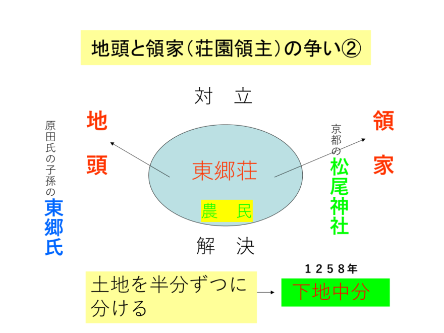 東郷荘にも激動の時代が訪れました。東郷氏は弱体化した松尾神社の下司職(げししき)の立場ではなく、幕府の御家人として新たに“地頭”に任命され、領家だった松尾神社の支配地に勢力を拡大するようになったのです。