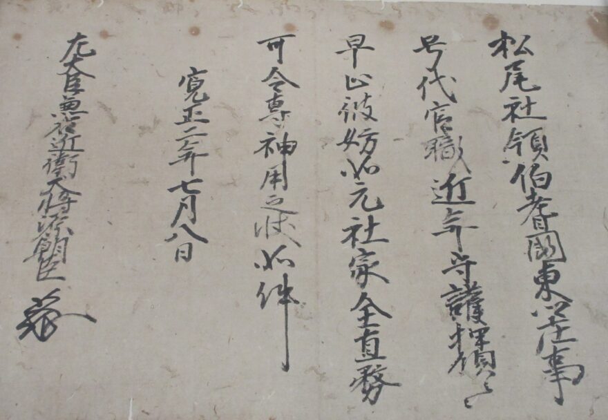 史料は、“足利義政御教書(みぎょうしょ)”と呼ばれるもので、松尾神社の社領である東郷荘を守護が侵略しているので、幕府に阻止してもらうために出された将軍の花押入りの文書です。