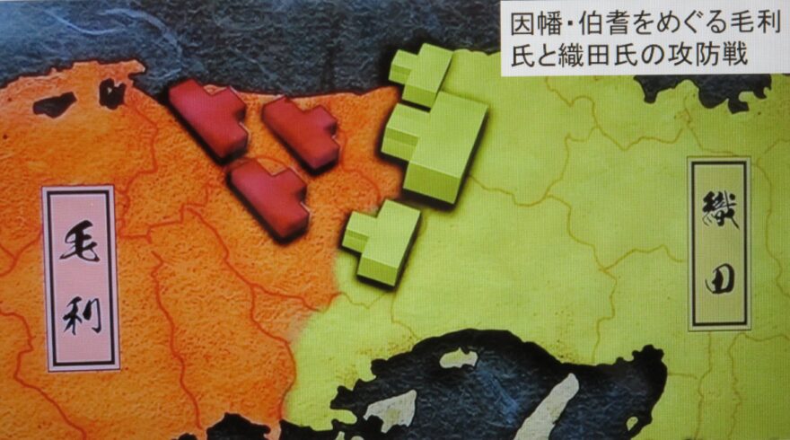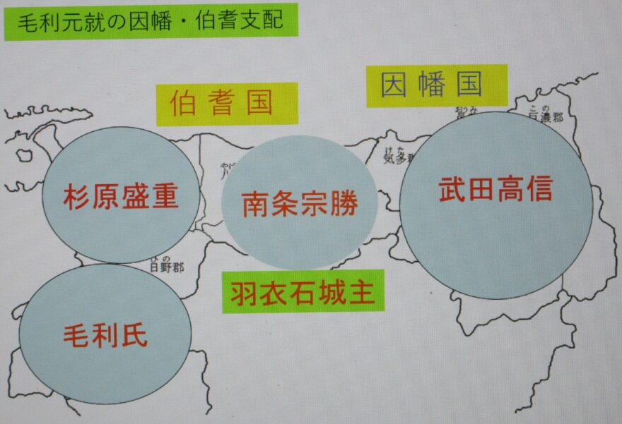 因幡と伯耆については、西伯耆南部は毛利氏が直接支配し、西伯耆北部は杉原盛重(もりしげ)に任せ、東伯耆は羽衣石城主南条宗勝(むねかつ)に、因幡は武田高信(たかのぶ)に支配を任せました。