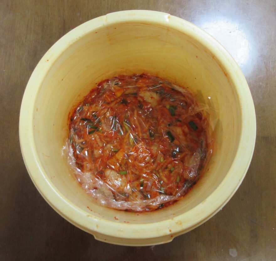 たくさんの野菜や調味料を入れたので、お母さんは驚いたんだって。完成したキムチをラップで密閉して一晩おくと、さらに美味しくなるんだって。あとは密閉容器に入れて冷蔵庫で保存するんだよ。