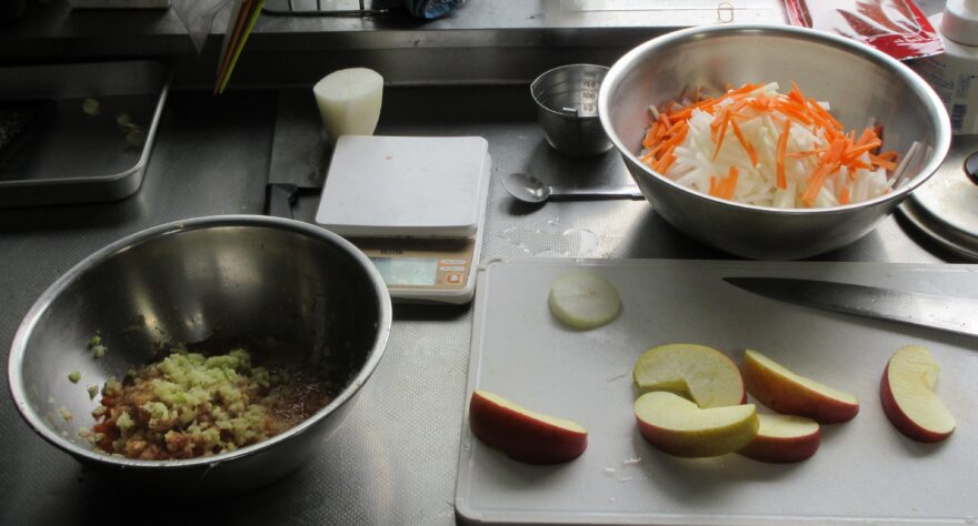 いよいよキムチを作る日、ワクワクだね。お兄さんとお義姉さんが塩漬けした白菜とキムチの材料を持ってやってきたよ。2,3日塩漬けにした白菜をよく絞って大根やにんじんの千切り、ニラを加えるんだよ。それから、すりおろしたリンゴ、にんじん、ショウガ、ニンニクを混ぜるんだよ。