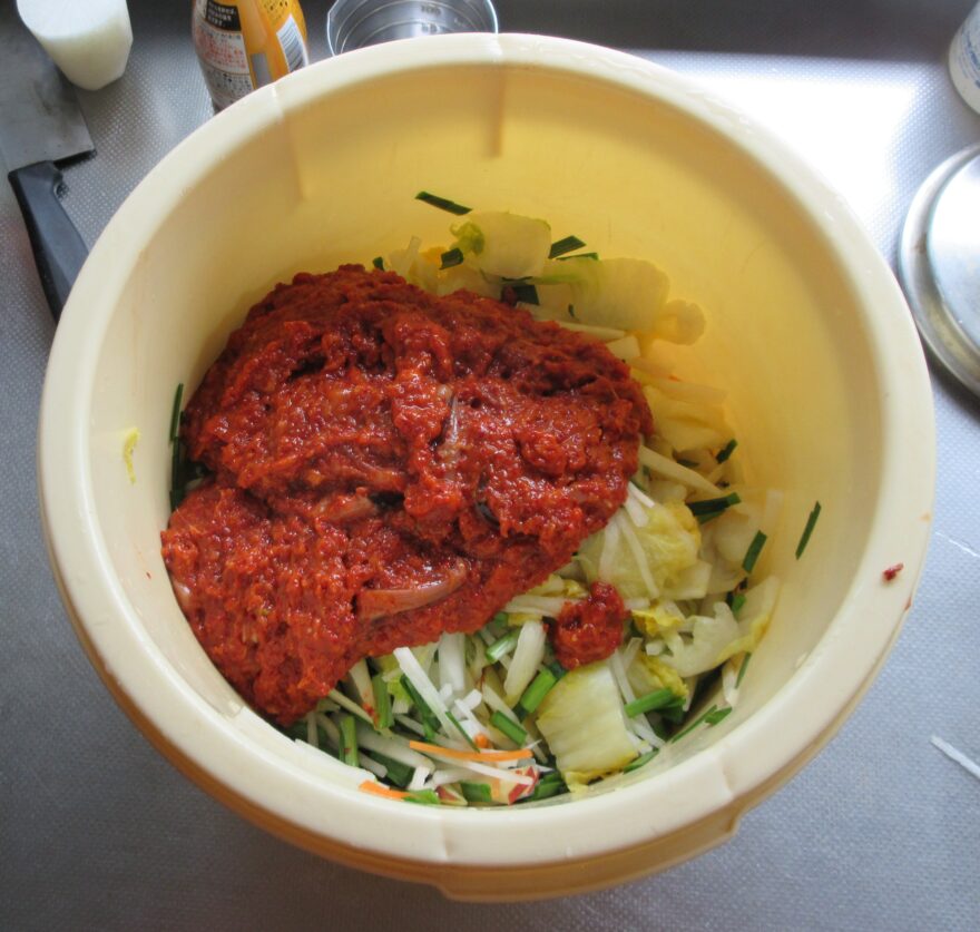 これで終わりではないんだよ。いかの塩辛や調味料の砂糖、塩、唐辛子粉、ナンプラーも加えて、さらに白玉粉をだし汁で練ってさましたものを加えるんだよ。この後、しっかりと混ぜたら、キムチが完成!